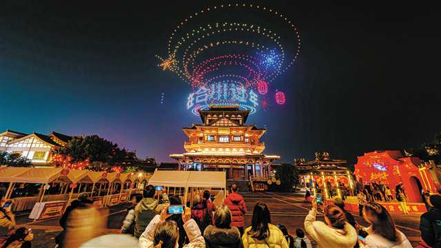 以“来合川过年——游名城”为牵引,钓鱼城、“最美江湾”等城市地标集中发力。钓鱼城景区以沉浸式体验为突破口,将古军营空间转化为可参与、可互动的文旅场景,“宋韵年味”“NPC巡游”“沉浸式话剧”等活动交织呈现,让历史文化在节庆氛围中“活”起来;嘉陵江沿线,无人机表演、迎春灯会点亮夜空,将城市发展成果、文化底蕴与节日景观融合表达,塑造出具有辨识度的城市夜游IP。